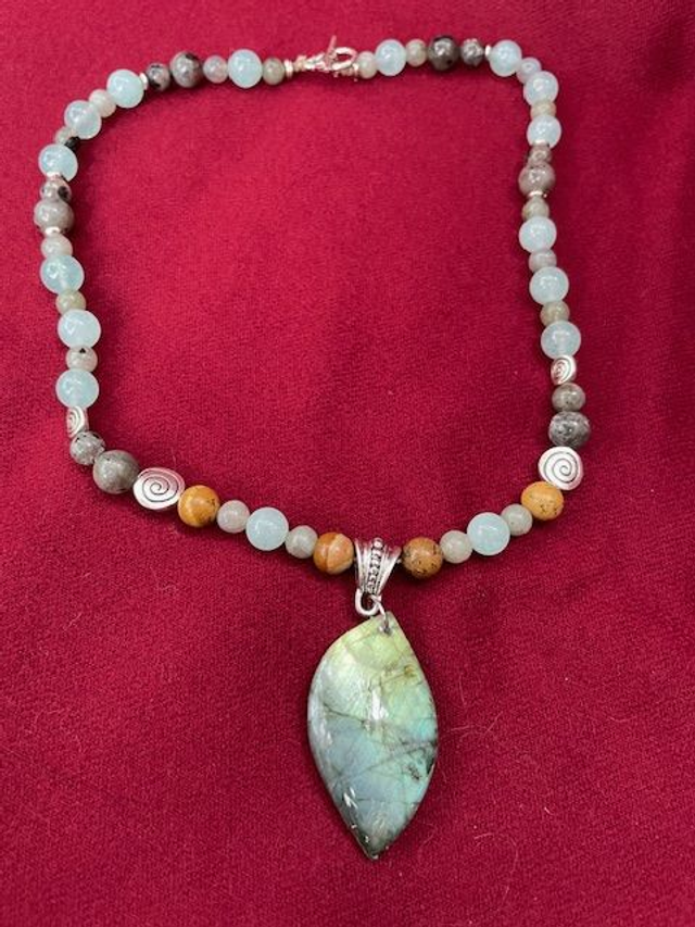 Collier sérénité, pièce unique en pierres semi précieuses , pendentif en labradorite, perles en angélite, labradorite, yooperlite, jaspe naturelle